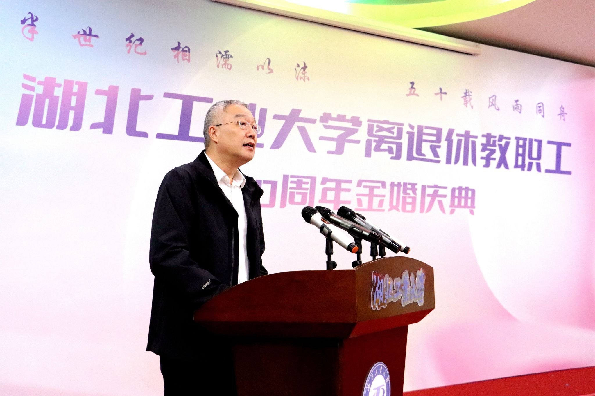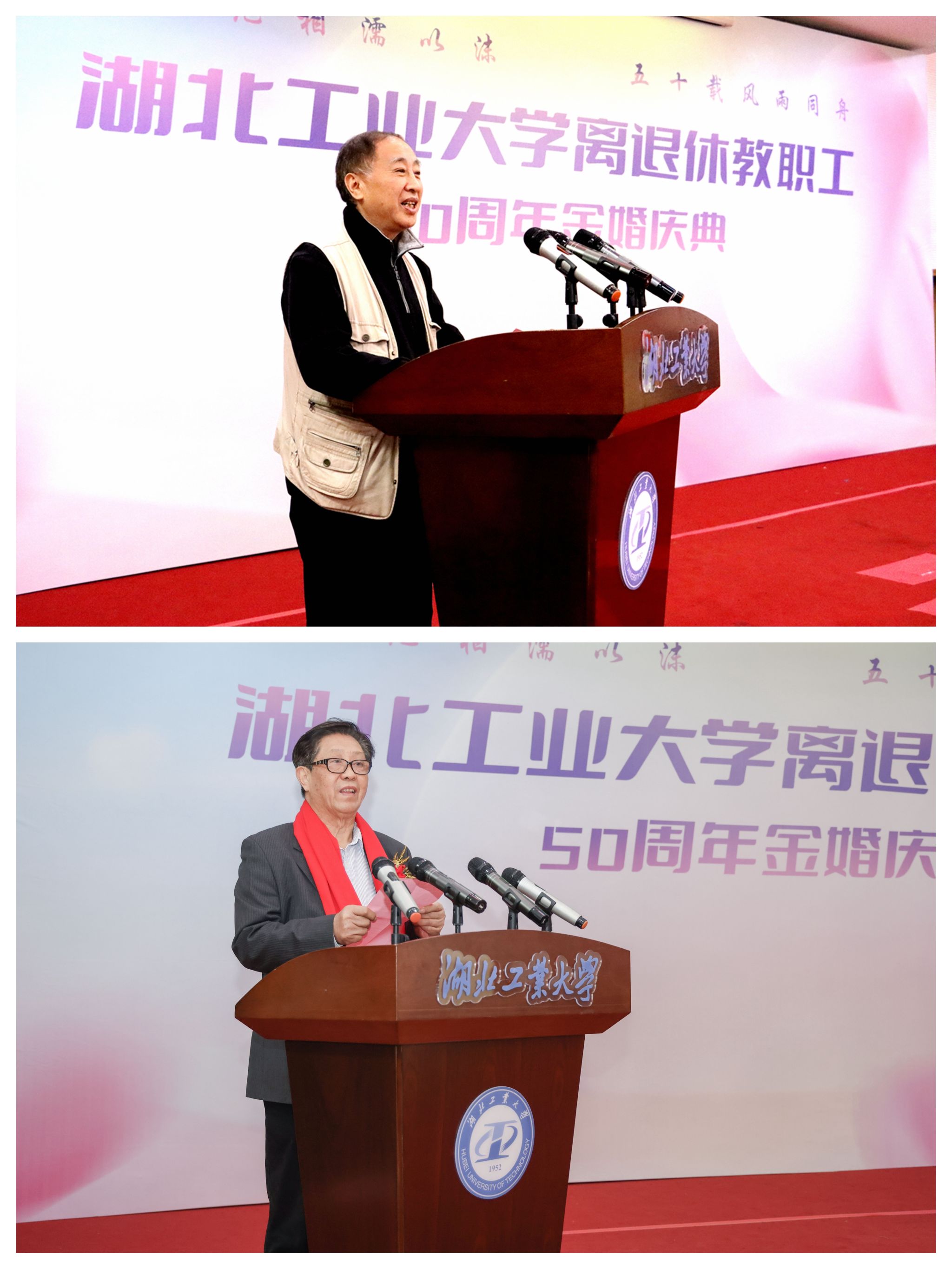 金婚夫妇代表、原湖北省机电研究院院长常恒毅,分享了夫妻间相濡以沫、相伴相守的经历和感悟,感谢学校的关怀,祝愿学校各项事业高质量发展。校“两协”刘发祥代表校老年人协会、老教授协会、全校离退休同志送上祝福,对学校给予老同志们的关心关爱表示衷心的感谢。