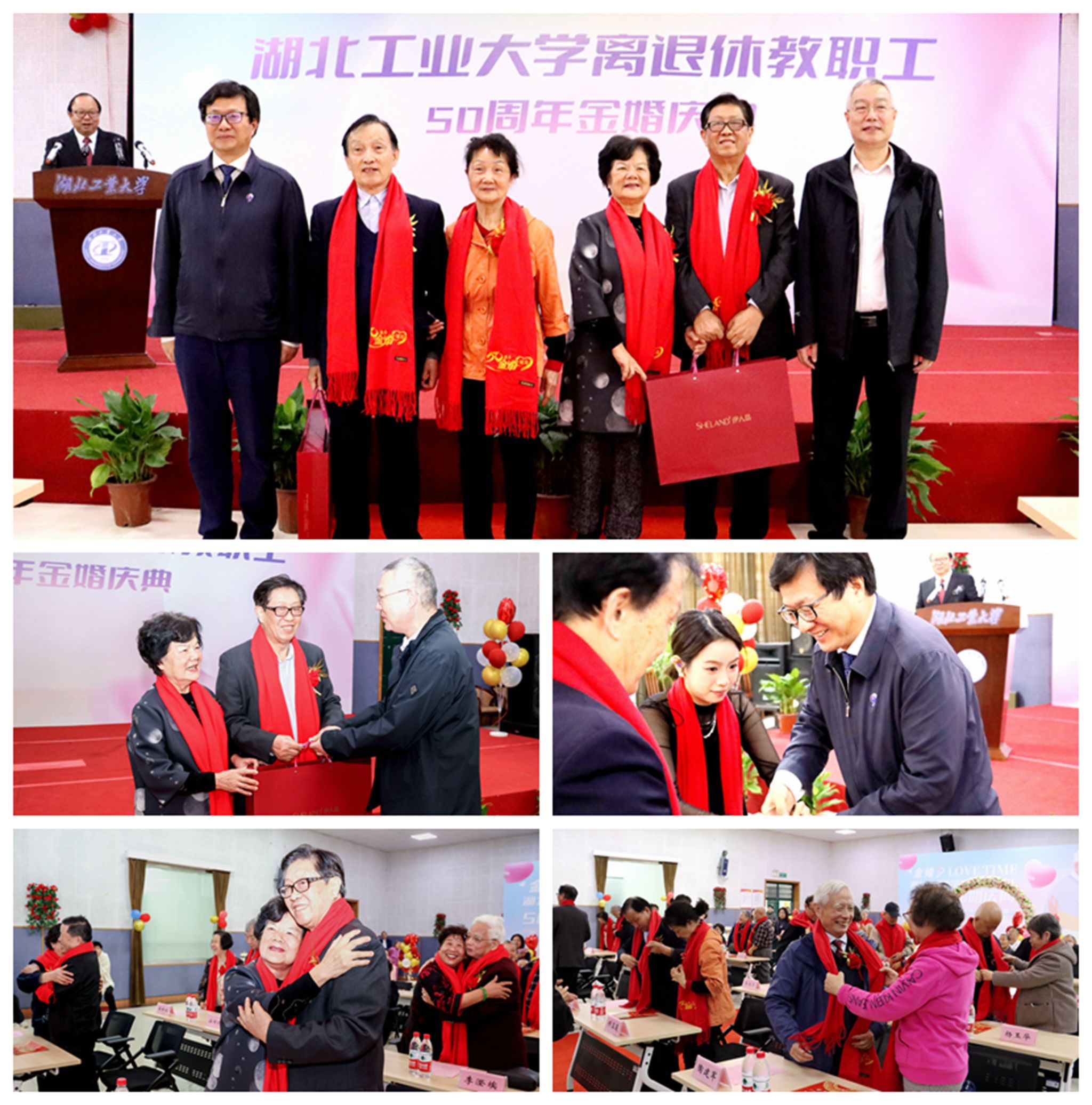 冯征代表学校党委、行政祝福金婚伉俪们恩爱永偕、天长地久,祝愿全体离退休老同志们身体健康、家庭幸福。他表示,尊老、敬老、爱老是我们湖工大的一贯传统,金婚庆典活动已坚持数年。金婚夫妇在事业上相扶相携、勤勉耕耘,在生活中鸿案相庄、互敬互谅,用行动树长者风范,以品德传清廉家风,为大家树立了携手奋进、传承文明、发扬风尚的学习榜样。