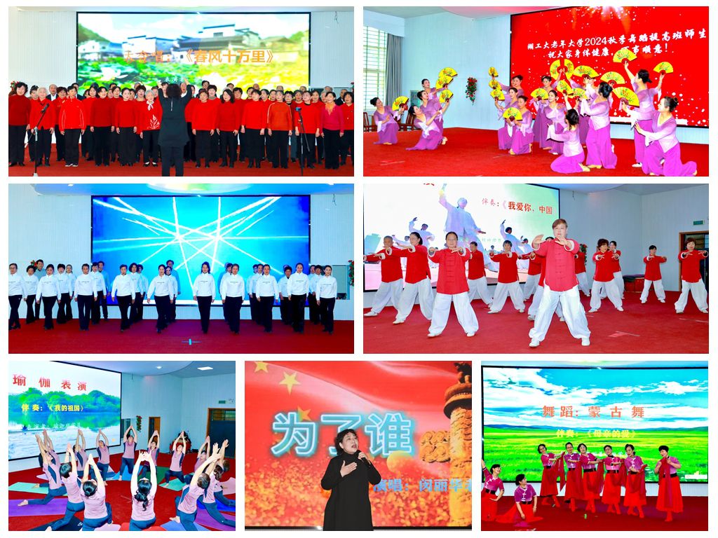 闵丽华老师深情演唱《为了谁》,表达了对老年教育事业的热爱与坚守。合唱班、太极班、舞蹈班、模特班、瑜伽班等学员们精神抖擞,意气风发,依次上台展示教学成果,展现了老年学员健康、昂扬、向上的精神风貌。