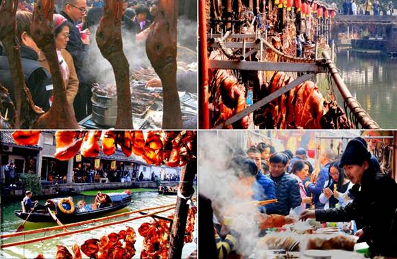 安昌镇离鲁迅老家不远,这里有一特产,用特制酱油腌制腊肉,腊鱼等很受游客欢迎。一到冬月这里就成了四处飘香的腊货世界。绍兴还有一特有的手脚并用划船姿势可在左下图中欣赏。