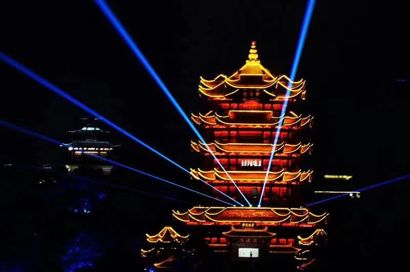 五十多米高耸的楼阁,每层楼檐的四角都挂着金色的铜铃,在微风的吹拂下,发出一阵阵悦耳的响声,仿佛向人们诉说着黄鹤楼的变迁。