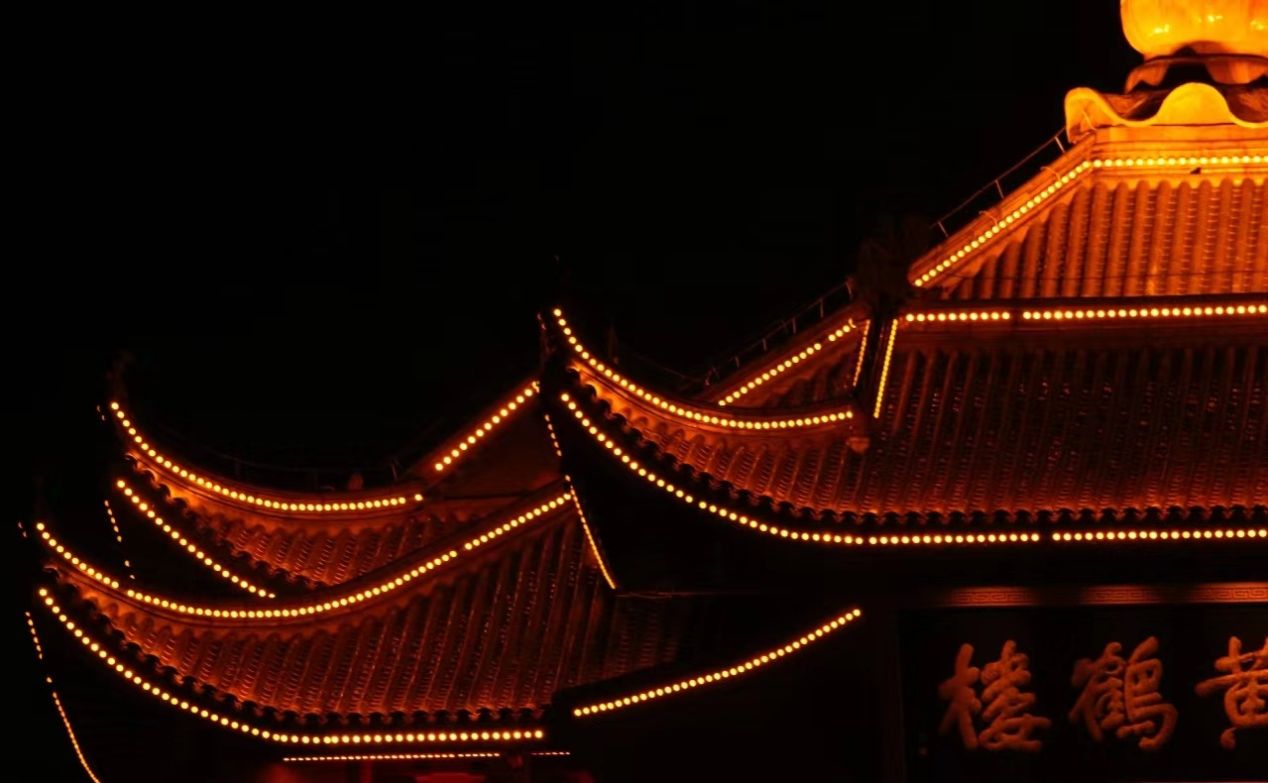 毎当夜晚,具有古典特色的飞檐在暖光的照耀下,富有雅致的美感。